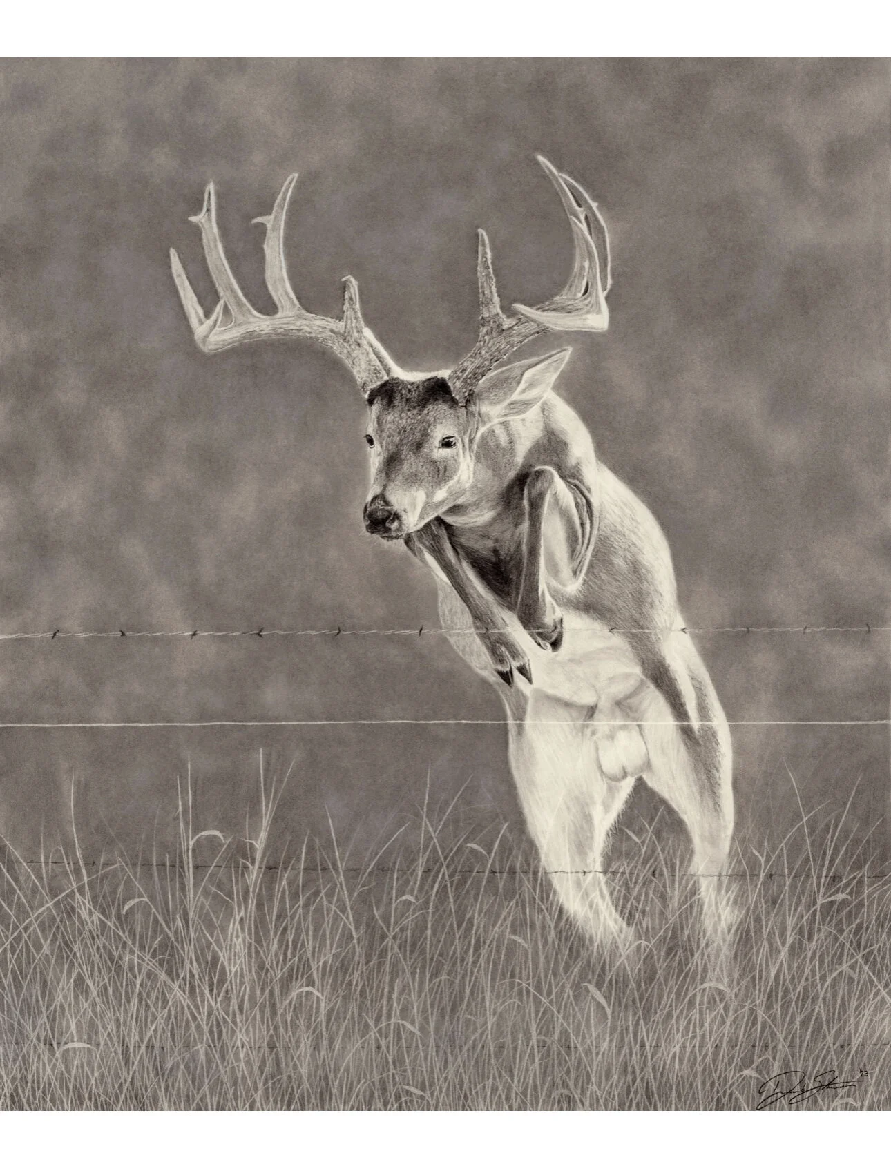 Original charcoal pencil drawing of a Whitetail Deer hopping a barbwire fence.